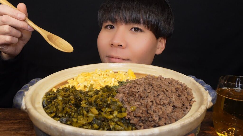 上の具材は牛と豚のひき肉と炒り卵と高菜の漬物です😋