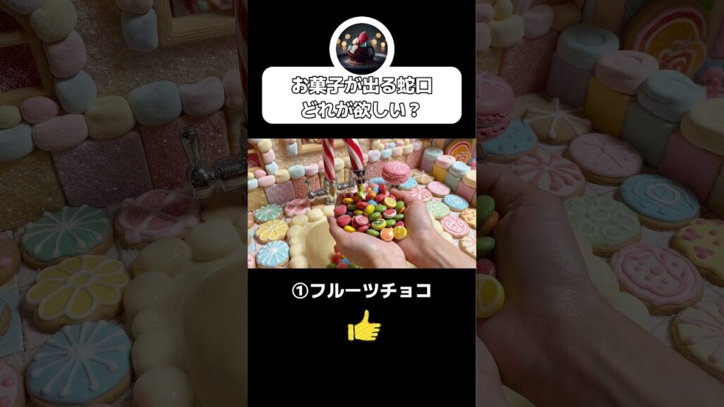 お菓子が流れる蛇口を静かに切り替えて紹介しています。