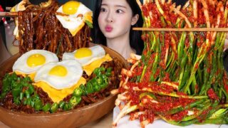 麺 ASMR MUKBANG | 매운 파김치 만든 날 🔥 청양고추 듬뿍 짜계치 먹방! Spicy Cheese and Eggs Black Bean Noodles & Pa-Kimchi