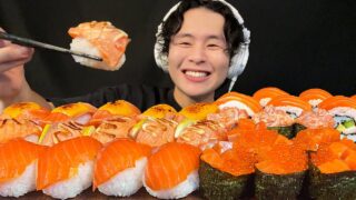 寿司 【ASMR】色んなサーモン寿司‼️【咀嚼音/mukbang/Eating Sounds】 ■本日のメニュー ・サーモン寿司 80kcal×4 ・炙りサーモンマヨ 100kcal×5 ・チーズサーモン 90kcal×5 ・カリフォルニアロール 60kc... 2025.09.25 寿司