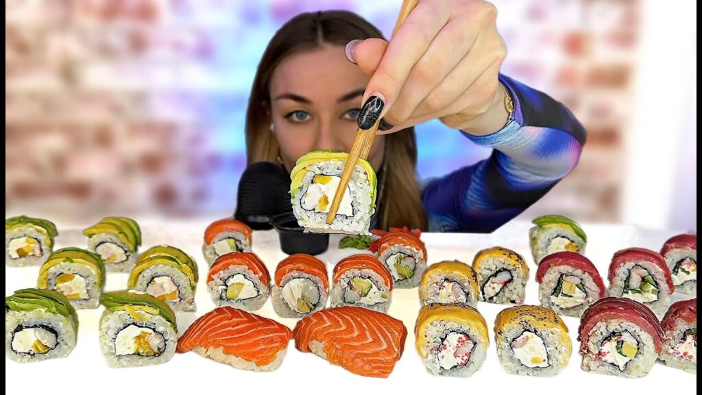 In this no-talking eating show, we enjoy a delicious platter of salmon sushi, tuna sushi, avocado rolls, and chess sushi, along with fresh sashimi salmon. Every bite is filled with soft rice textures, fresh fish, creamy avocado, and real chewing sounds. Pure ASMR relaxation — no talking, just sushi sounds.
