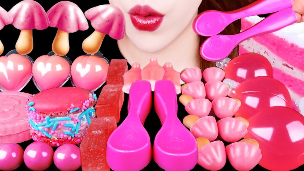 ASMR Strawberry food *Ice cream macaron, strawberry spoon chocolate, peach jelly, chocolate mushroom, strawberry Biscuit, chocolate ball, peach tiktok jelly, frozen wax bottle candy, cake, sugar jelly